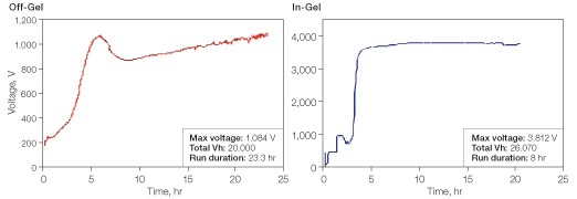 Fig 2. Voltage profiles for off-gel and in-gel peptide separations. A HeLa cell digest was separated on 11 cm pH 3–10 IPG strips. The current limit for both separations was 50 µA per IPG strip. The off-gel separation was performed on the OFFGEL fractionator. The in-gel separation was performed on the PROTEAN i12 IEF cell.